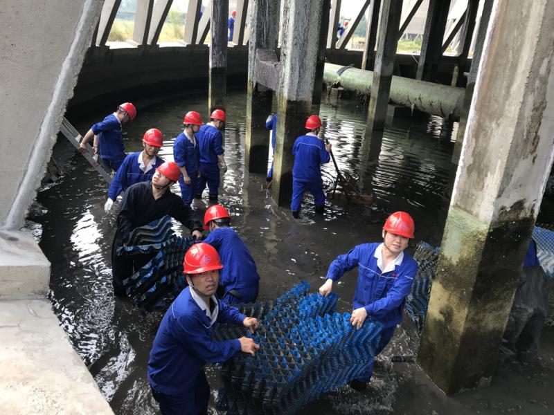 活動中,黨員們戴著安全帽、穿著雨鞋下到近半米深的淤泥中,對淤泥上成堆的破損填料進行清理。黨員們兩人一組,一起將淤泥中的廢填料抬到2米高的水泥地面,填料上的淤泥和污水濺到黨員們的臉上、胳膊上、衣服上,池底的污水倒灌進雨鞋,不一會大家個個都成了泥人。大家不顧臟累,雜物清理完成后,大家合力用木推子把淤泥進行搬運,由于淤泥又厚又沉,汗水浸濕了黨員們的衣背。最后,大家又將規整后的淤泥裝入袋子,整齊碼好,用起吊設備將淤泥吊裝運走。