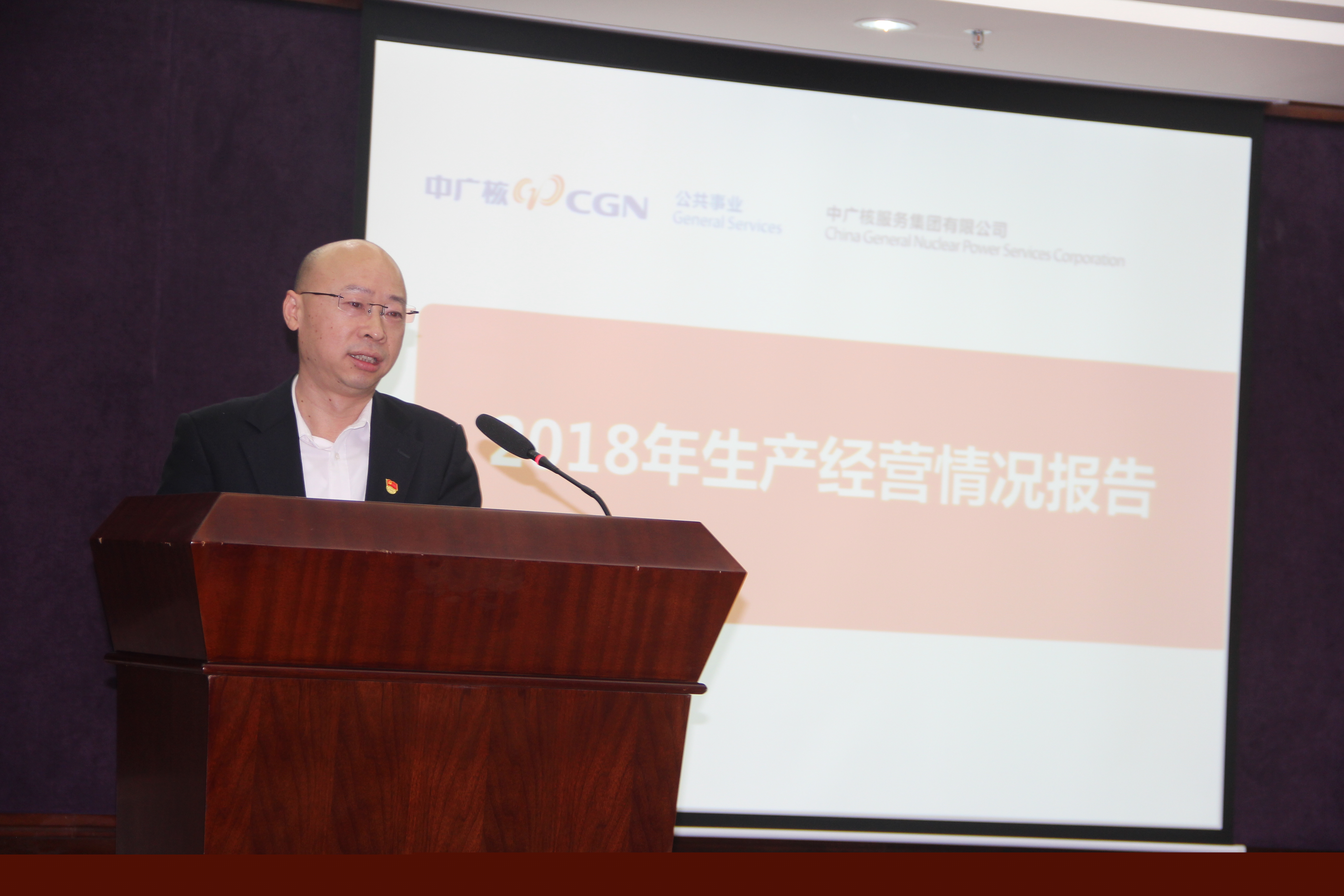 王楚亮代表經(jīng)營班子向大會作《2018年生產經(jīng)營情況報告》,匯報了中廣核服、中廣核環(huán)保2018年生產經(jīng)營情況和2019年工作計劃。