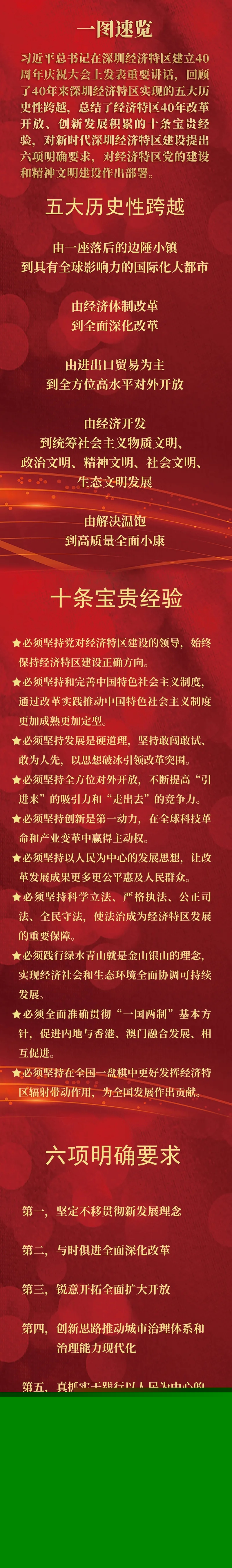 習(xí)近平總書記在深圳經(jīng)濟(jì)特區(qū)建立40周年慶祝大會上發(fā)表重要講話,回顧了40年來深圳經(jīng)濟(jì)特區(qū)實(shí)現(xiàn)的五大歷史性跨越,總結(jié)了經(jīng)濟(jì)特區(qū)40年改革開放、創(chuàng)新發(fā)展積累的十條寶貴經(jīng)驗(yàn),對新時代深圳經(jīng)濟(jì)特區(qū)建設(shè)提出六項明確要求,對經(jīng)濟(jì)特區(qū)黨的建設(shè)和精神文明建設(shè)作出部署。