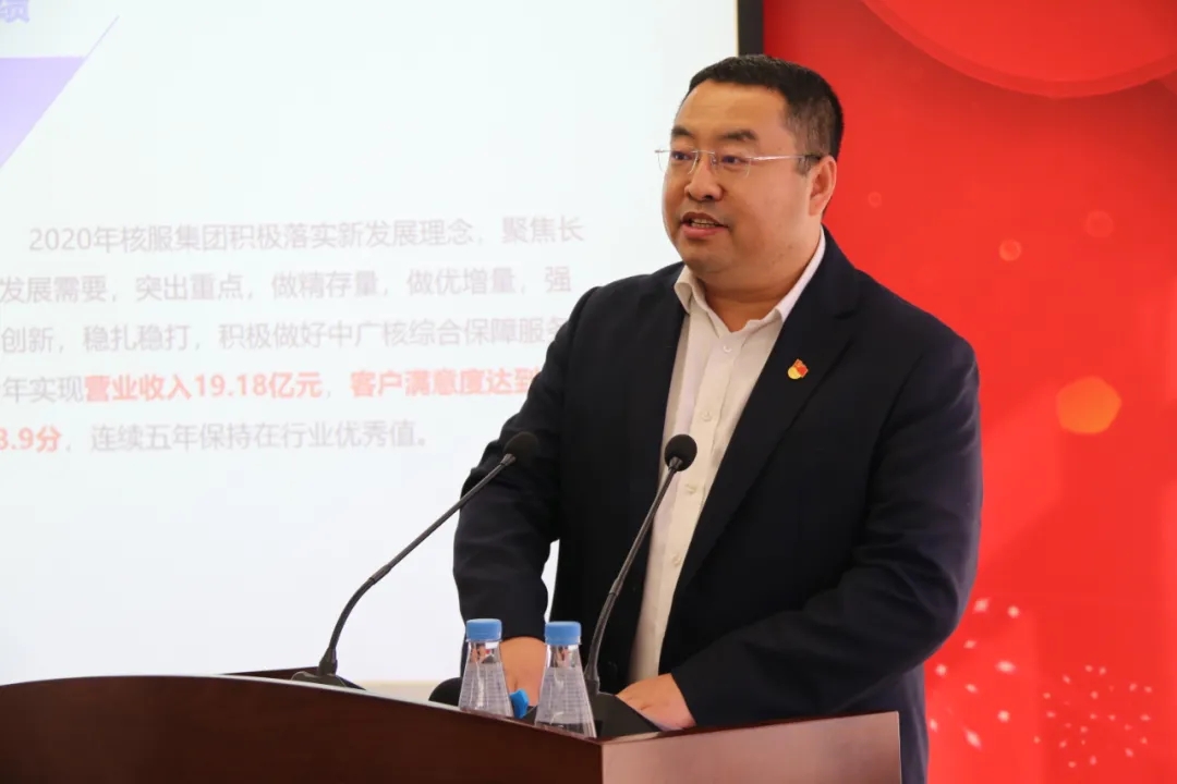 劉清明傳達了中廣核黨委常委、副總經理龐松濤的工作寄語。龐松濤對中廣核服在服務保障、疫情防控、脫貧攻堅等方面工作給予了充分肯定,對長期奮戰在服務保障一線員工的辛勤付出表示感謝,并對中廣核服2021年工作提出了三點要求,一是聚焦主責主業,加強后勤服務標準化建設和安全能力建設,持續提升競爭力;二是聚焦重點工作,加大工作力度和改革力度,全力開創良好局面;三是抓實抓好黨的領導,深入“服務先鋒”品牌建設,為發展保駕護航。